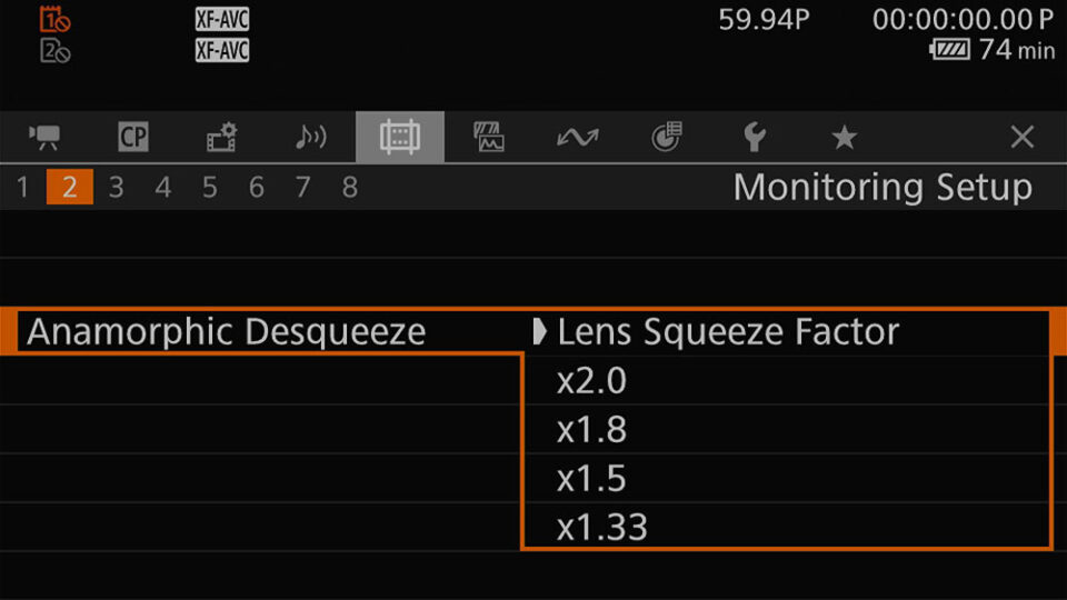Les objectifs anamorphoseurs ont un élément arrière allongé qui permet d'utiliser des effets de reflets et de bokeh que les objectifs ordinaires ne peuvent pas donner. L’appareil EOS C50 offre des options de décompression du grossissement : désactivé/2x/1,8x/1,5x/1,3x.